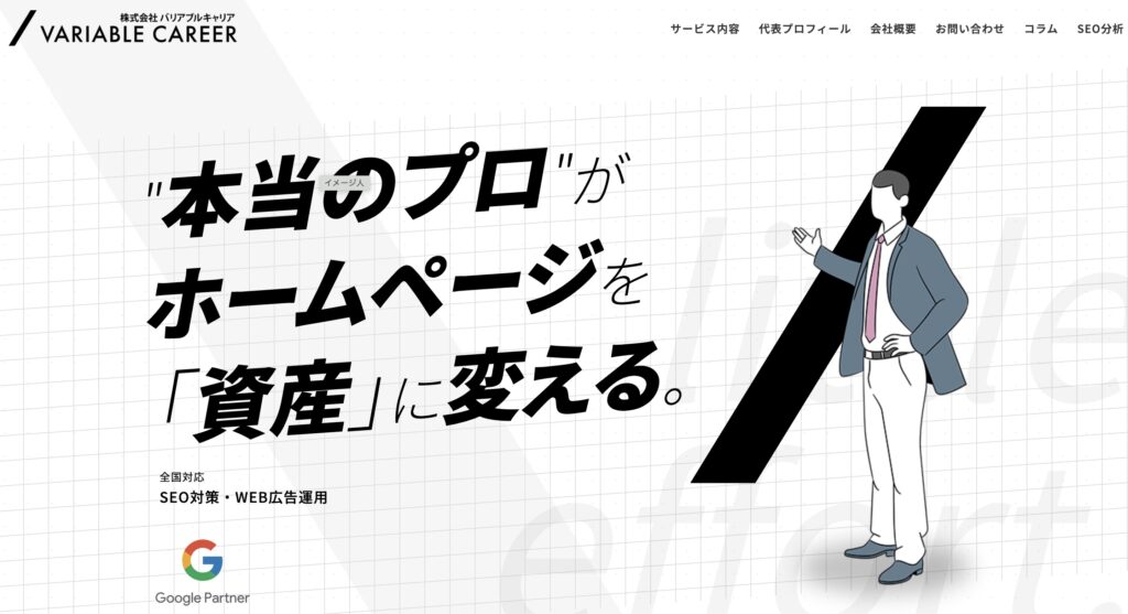 SEO対策会社のバリアブルキャリアは、競合サイトの分析や内部対策、オウンドメディア制作など、SEO対策のサポートをマーケティング視点で実施しています。