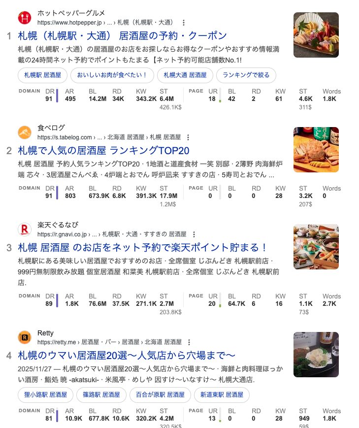「札幌 居酒屋」で検索すると80以上のサイトばかりで厳しいことがわかります。