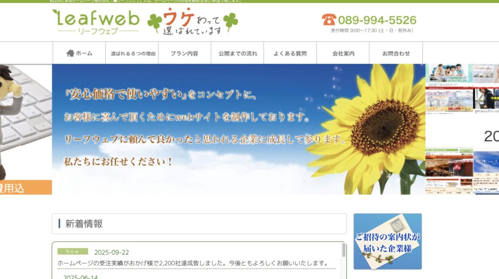 愛媛県松山市を拠点に活動する株式会社リーフウェブは、ホームページ制作から更新・保守、ドメイン・サーバ管理までを月額3,000円台から提供する制作会社です。初期費用は3万円からと手頃で、個人事業主や中小企業でも導入しやすい料金設定が魅力。公開後の修正対応や丁寧なサポート体制により、初めてホームページを作る方も、リニューアルを検討されている方も安心して依頼できます。全国対応・2,200件以上の実績を誇る信頼のパートナーです。