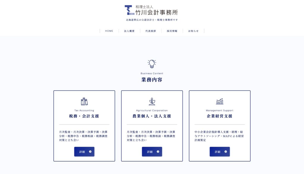 税理士法人きずな会計事務所では、「わかりやすさ」を追求したシンプルなホームページが特徴です。