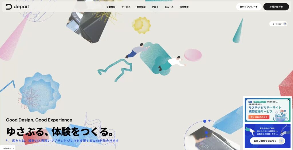 株式会社デパートのホームページは「ゆさぶる、体験をつくる。」をコンセプトに、UXデザイン、ユーザビリティ、アクセシビリティといった人間中心の設計を得意とするWeb制作会社です。