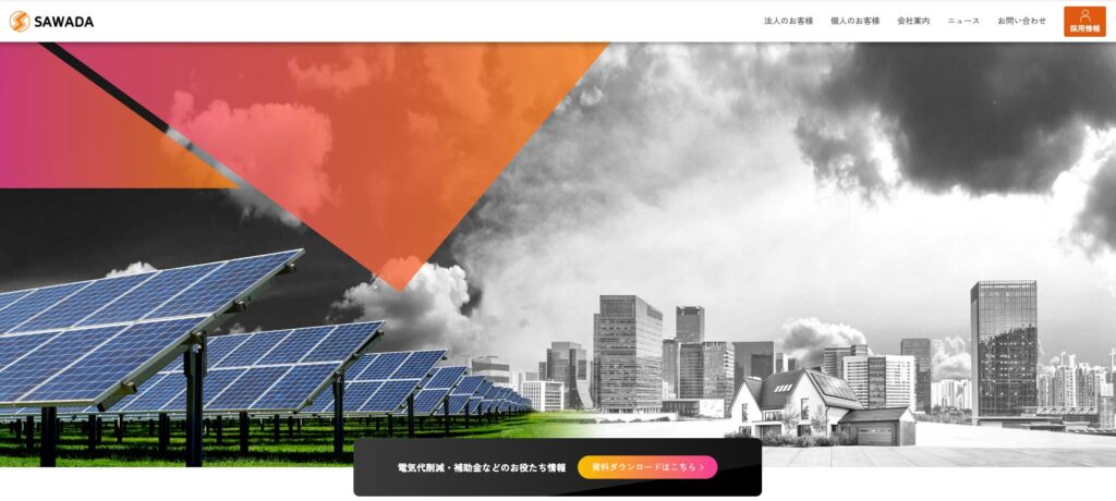 「広島で太陽光といえばSAWADA」をキャッチフレーズに、法人・個人向けの太陽光発電事業を展開する企業です。