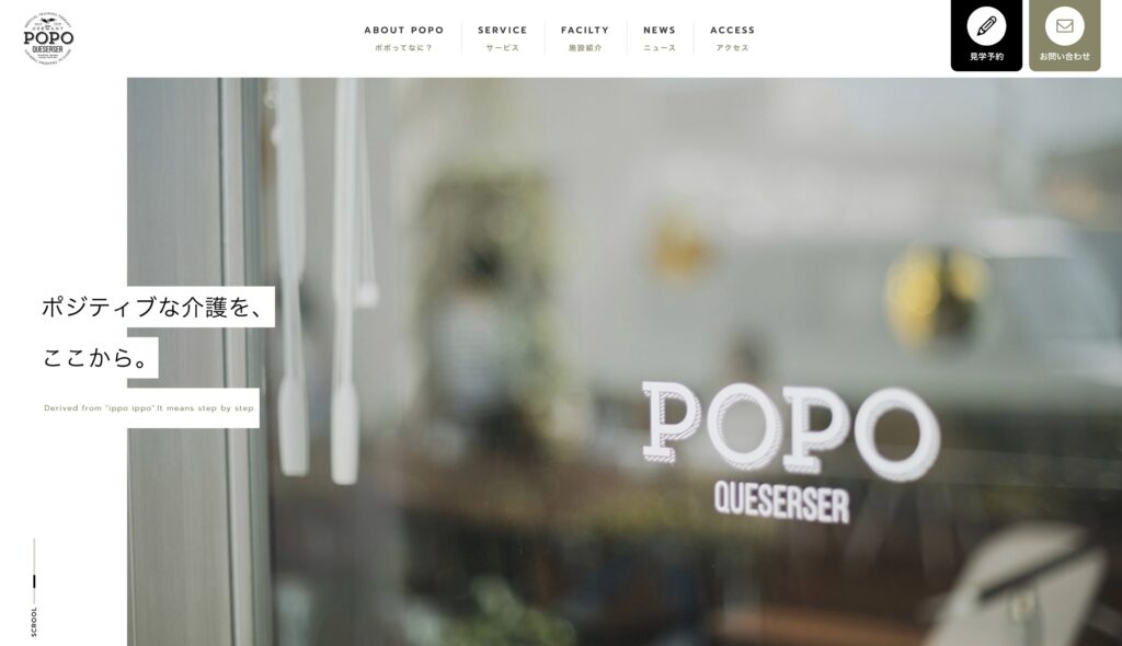 「ポジティブな介護を、ここから。」というメッセージを掲げた、白と黒のシンプルでモダンなデザイン。
