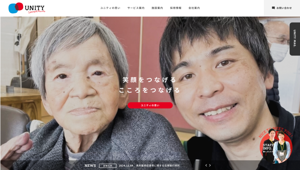 スタッフの人柄や施設の雰囲気が伝わる写真を効果的に使用。