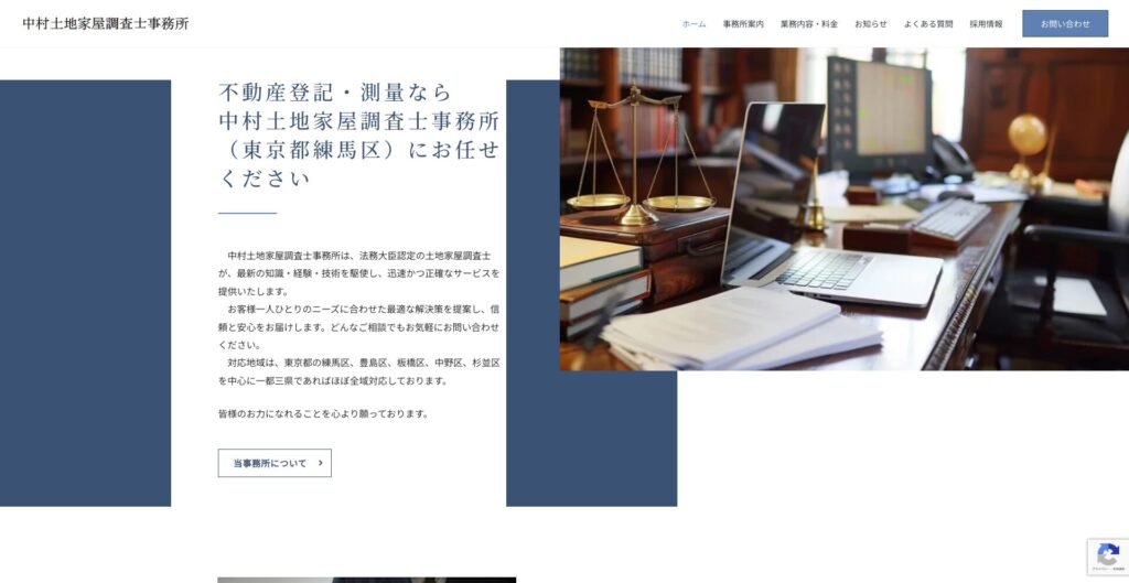 練馬区の中村事務所。「不動産登記・測量なら中村土地家屋調査士事務所にお任せください」というキャッチコピーで安心感を訴求。