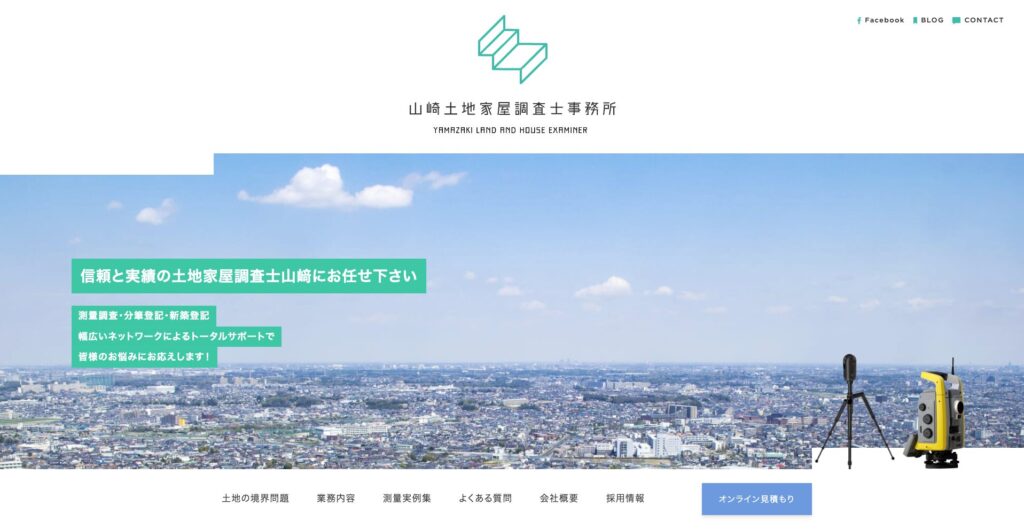 緑色をアクセントにしたデザインで、トップに「信頼と実績の土地家屋調査士 山﨑にお任せ下さい」という明快なメッセージを配置。