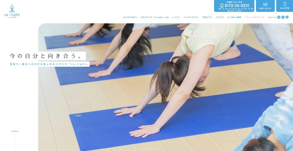 明るくクリーンなデザインで、青森エリア発ヨガ専門スタジオであることを謳うサイト。