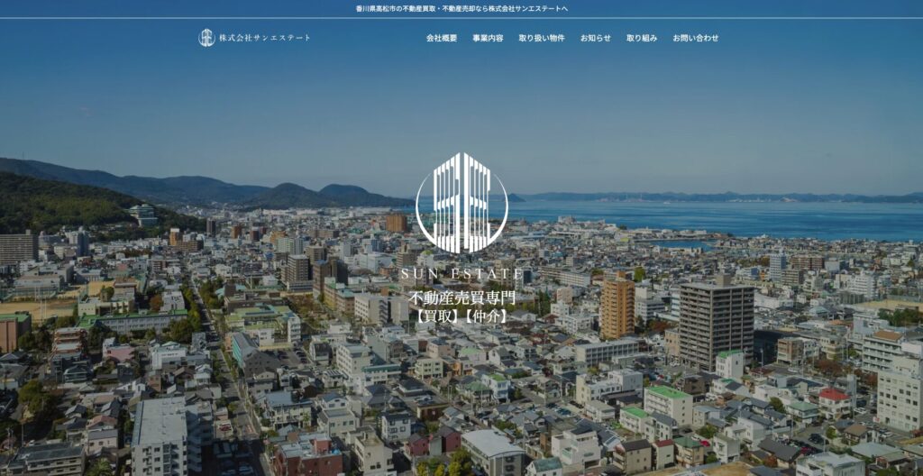 「高松市の不動産買取・不動産売却ならサンエステートへ」と明快にうたうトップメッセージが信頼感を与えています。