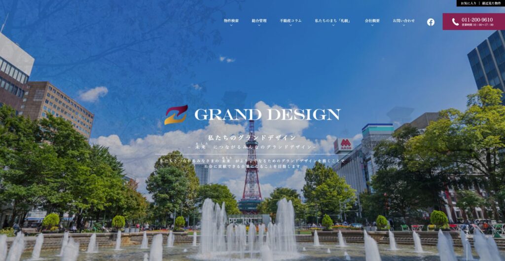 トップページでは「未来につながるみんなのグランドデザイン」という企業理念を日本語と英語で大胆に掲示し、洗練されたビジュアルで訪問者を出迎えています。