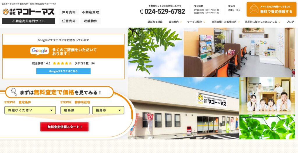 「福島市・郡山市の不動産売却・買取は株式会社マコトーマス」と大きく謳い、複数都市にまたがるサービス提供エリアを明確に伝えています。