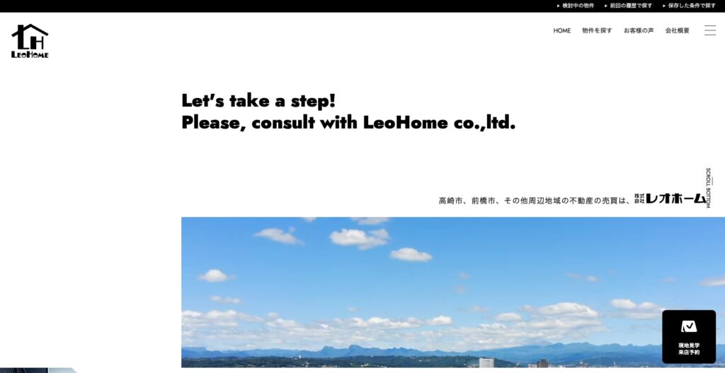 「高崎市、前橋市、その他周辺地域の不動産の売買はレオホームまで」と地域密着を強調したキャッチコピーがトップに掲げられ、エリア内で住まいを売り買いしたいユーザーに強くアピールしています。