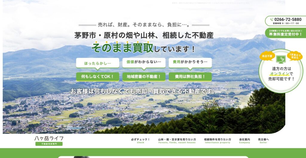 ホームページ冒頭では「茅野市・原村の畑や山林、相続した不動産そのまま買取しています!」との力強いメッセージが掲げられ、手間なく早期に現金化したい売主に寄り添う姿勢を示しています。