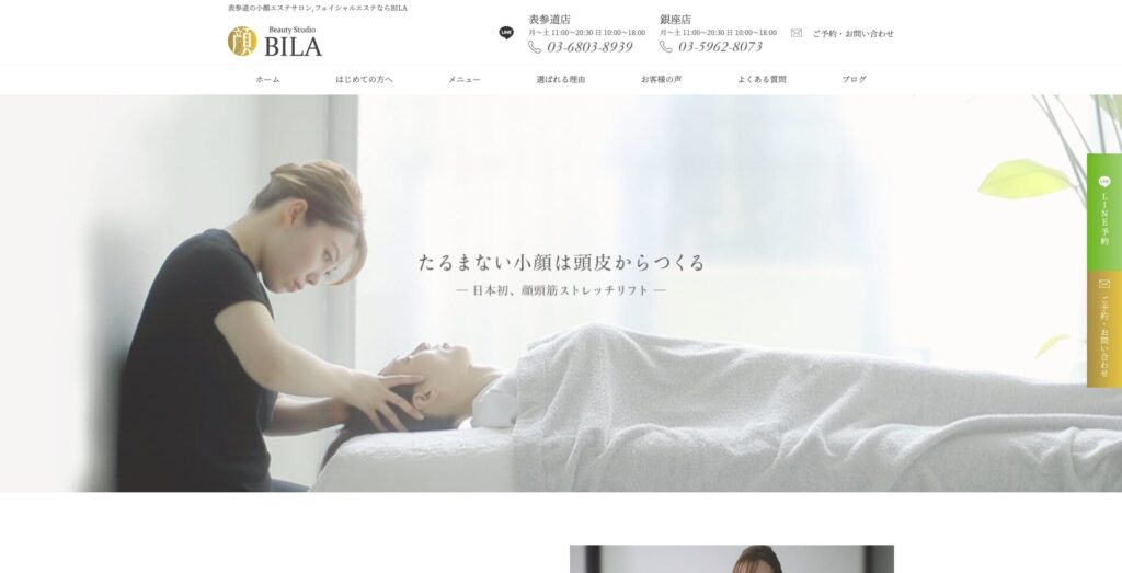 BILA公式サイトのホームページでは、日本初の独自技術「顔頭筋ストレッチリフト」を大きく打ち出し、顔と頭皮の筋肉に同時アプローチすることでリバウンドのない小顔効果を実現する点を強調しています。