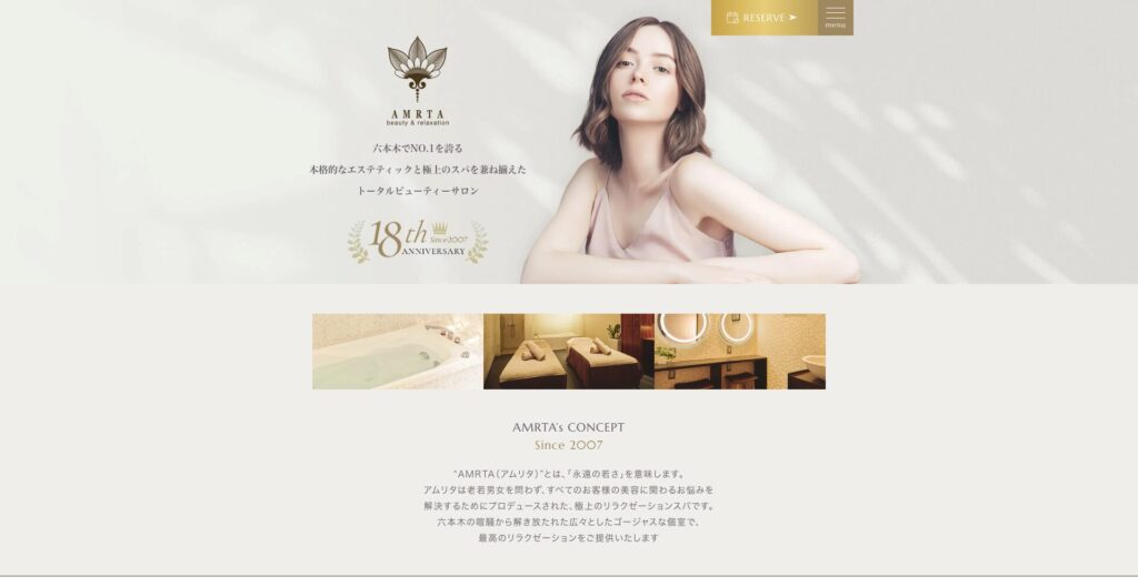 都会型リラクゼーションサロンの例として、印象的なキャッチフレーズをトップに大きく配置し、サロンコンセプトが一目で伝わるデザインです。