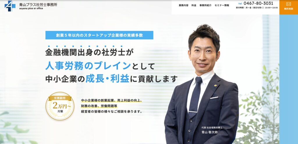 代表者の顔写真を大きくフィーチャーし、「金融機関出身社労士」といった肩書を強調。
