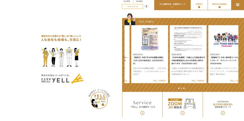 20名以上の社労士スタッフや200超の顧問先数をトップページで強調し、専門性と実績を可視化。