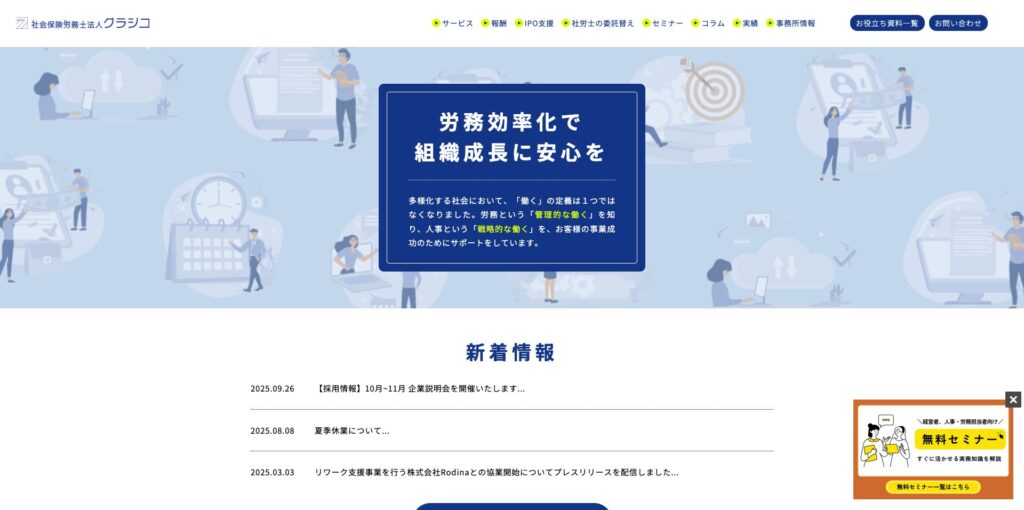 社労士業務のダウンロード用書式資料など実用的なコンテンツも充実し、訪問者に便益を提供しています。