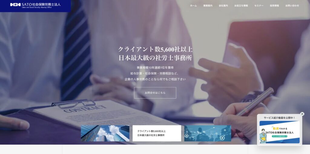 国内最大級の規模を誇る社労士法人で、トップに大きな企業ビルやビジネス風景のスライダーを配置しフォーマルな印象を与えます。