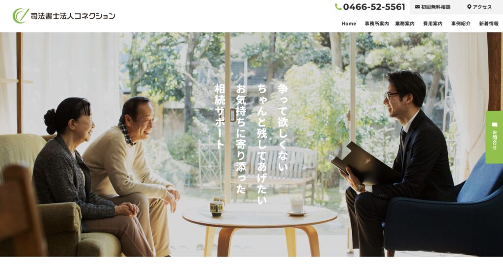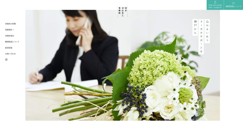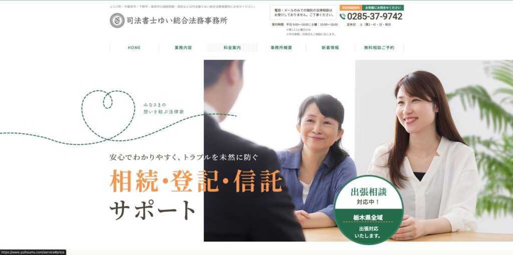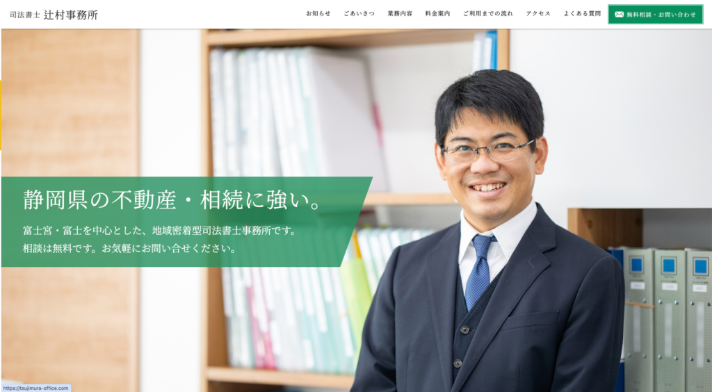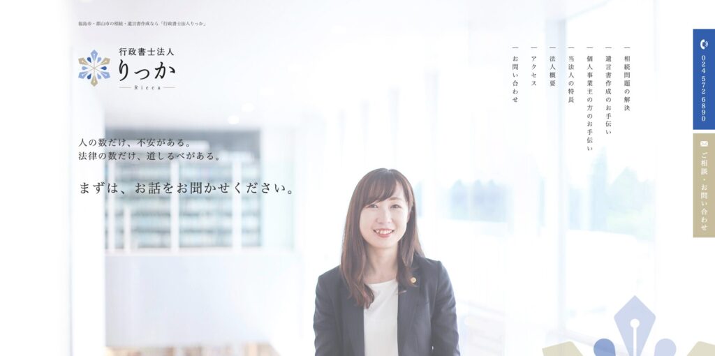 サイト全体に女性司法書士ならではの気配りが感じられる親しみやすいデザインで、相談者に安心感を与えています。