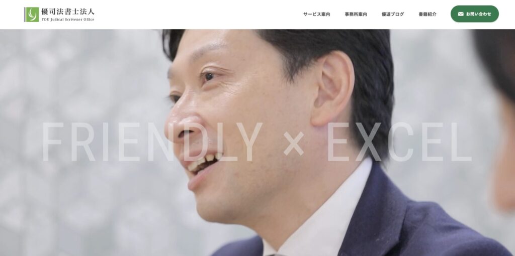 ファーストビューに司法書士が顧客対応する動画を配置し、実務を伝えることで信頼感を高めています。