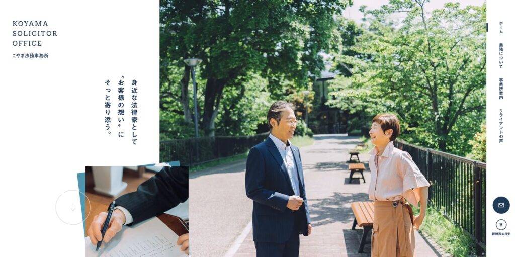 暖色系の色合いと簡潔なナビゲーションで、依頼者が気軽に相談しやすい期待感を演出しています。