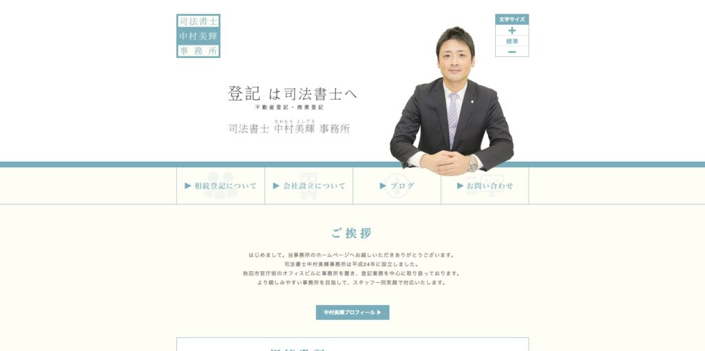余白を生かしたシンプルな構成で司法書士の顔写真がしっかり見えるホームページです。