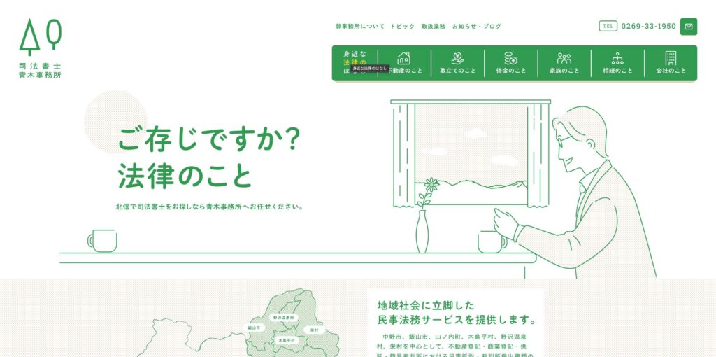 司法書士の笑顔写真とグリーンを基調にした配色で、ユーザーに安心感を与えるホームページです。