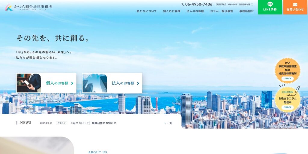 兵庫県尼崎市のかつら綜合法律事務所では、個人・法人を対象に「個人のお客様」「法人のお客様」という二大導線を大きなバナーで提示しています。