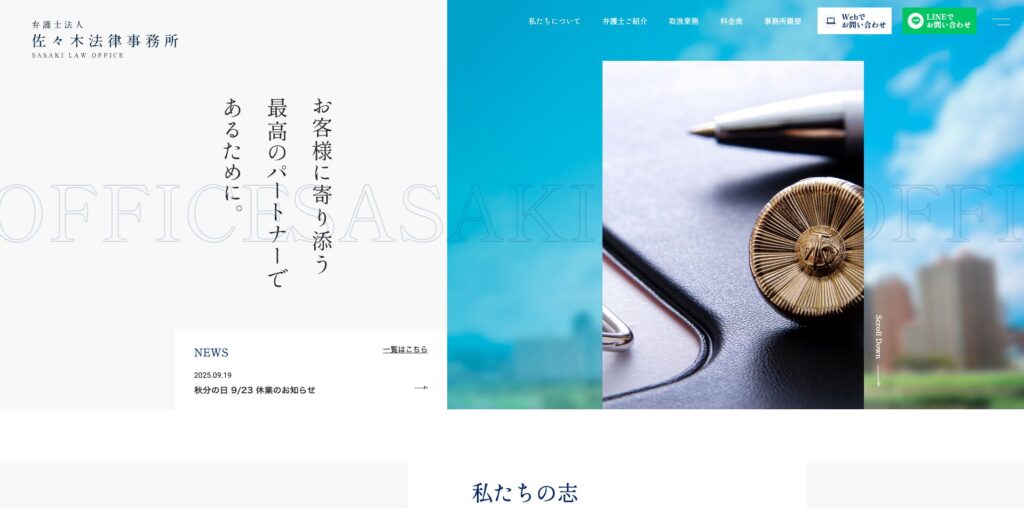 北海道札幌市の佐々木法律事務所サイトは、背景に自然豊かな風景を配し、白を基調に濃紺をアクセントカラーとした爽やかなデザインです。