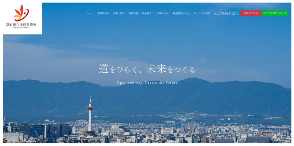 京都市右京区の洛彩総合法律事務所サイトは、古都京都の落ち着いたイメージを醸す配色とキャッチコピーが特徴です。