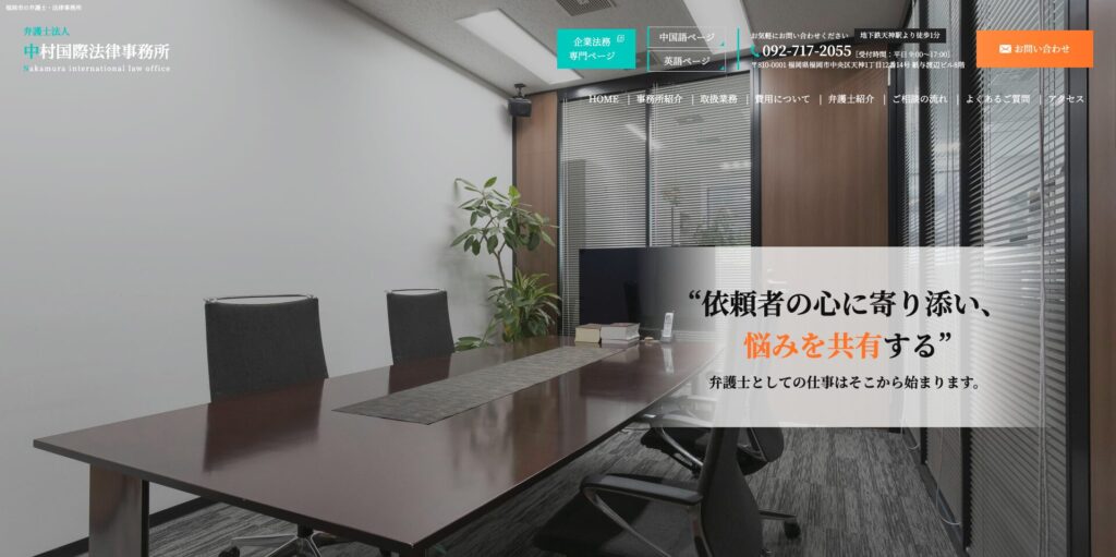 福岡市中央区の中村国際法律事務所サイトは、地下鉄天神駅から徒歩1分の好立地を大きく表示し、「依頼者の心に寄り添う」を掲げたメッセージを中心に据えています。