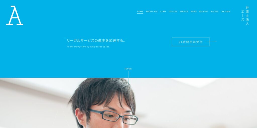 東京都中央区銀座の弁護士法人エースのサイトは、白を基調とした画面に爽やかな水色をアクセントとして配したデザインで、清潔感と信頼感を印象づけています。