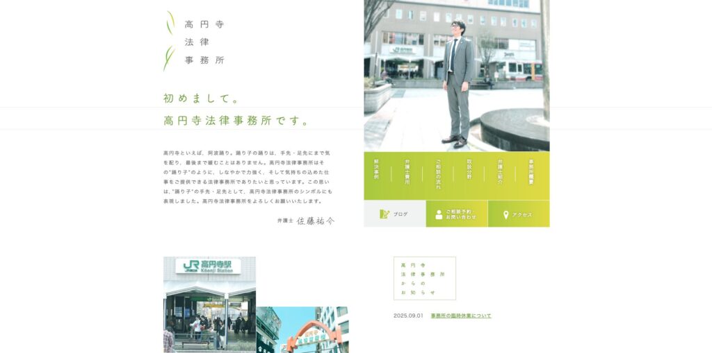 東京都杉並区高円寺の高円寺法律事務所サイトは、阿波踊りの「踊り子」をモチーフにしたロゴとテキストが特徴的です(「しなやかで力強く…踊り子のように」)。