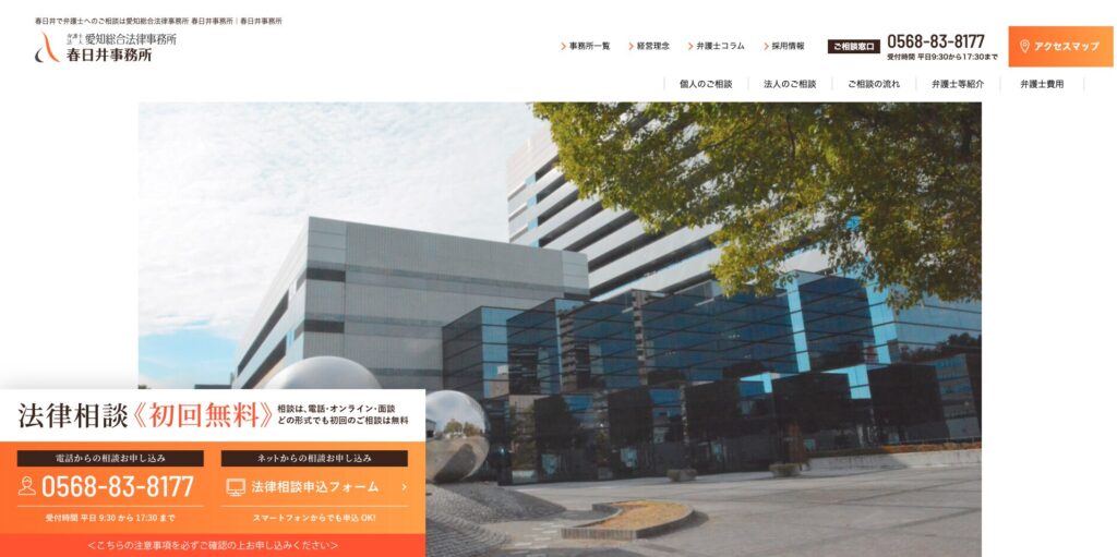 個人・企業別の相談メニューが一覧化され、フッターに事務所ビルの外観画像を掲載することで所在地がすぐにわかるようになっています。