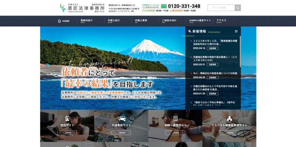 トップには大きく事務所名を表示し、経歴と事務所所在地を明瞭に示すレイアウトで、ユーザーに安心感を与えています。