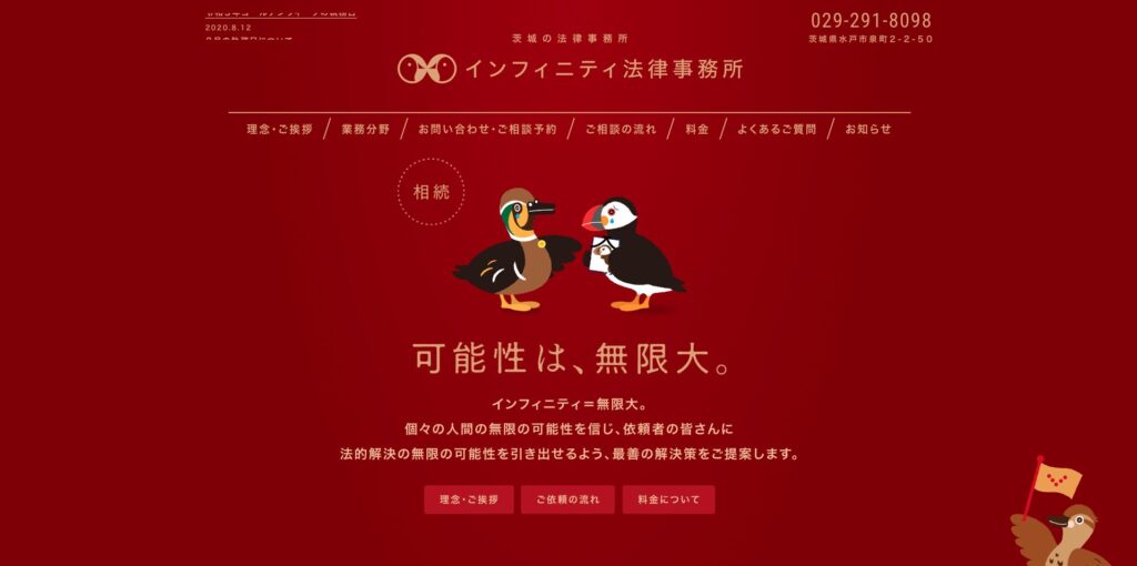 茨城県水戸市のインフィニティ法律事務所サイトは、全体に重厚感のある赤を背景に使用しつつ、所々にかわいらしいイラストを散りばめたデザインが特徴です。