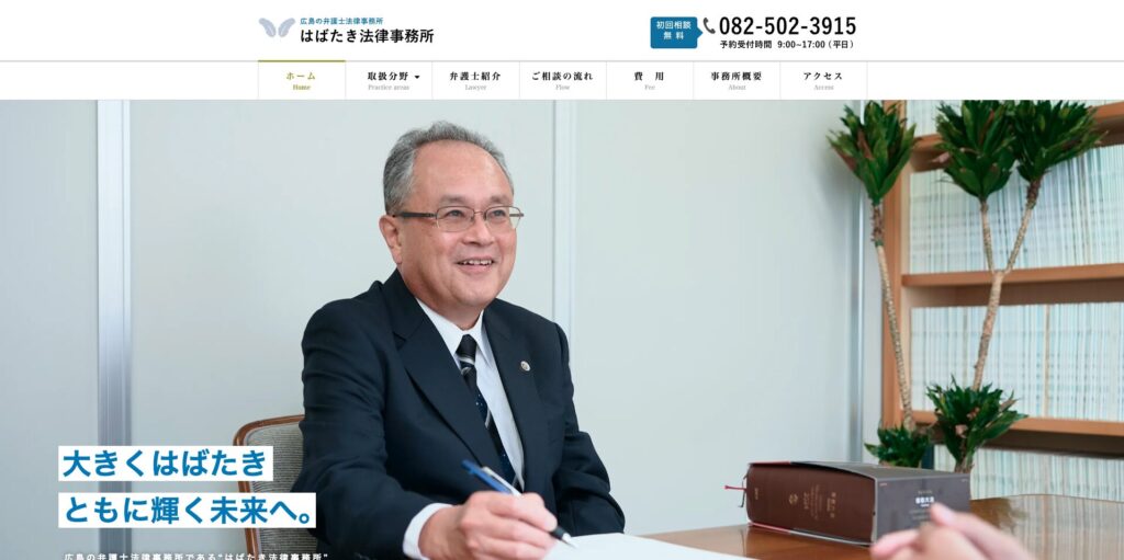 広島市中区のはばたき法律事務所は、「大きくはばたき ともに輝く未来へ」というキャッチコピーとロゴで、青空を思わせる爽やかなデザインを演出しています。