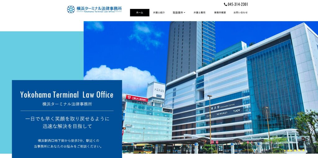 神奈川県横浜市の横浜ターミナル法律事務所サイトは、「横浜駅西口すぐ」という好立地を前面に出したデザインです。