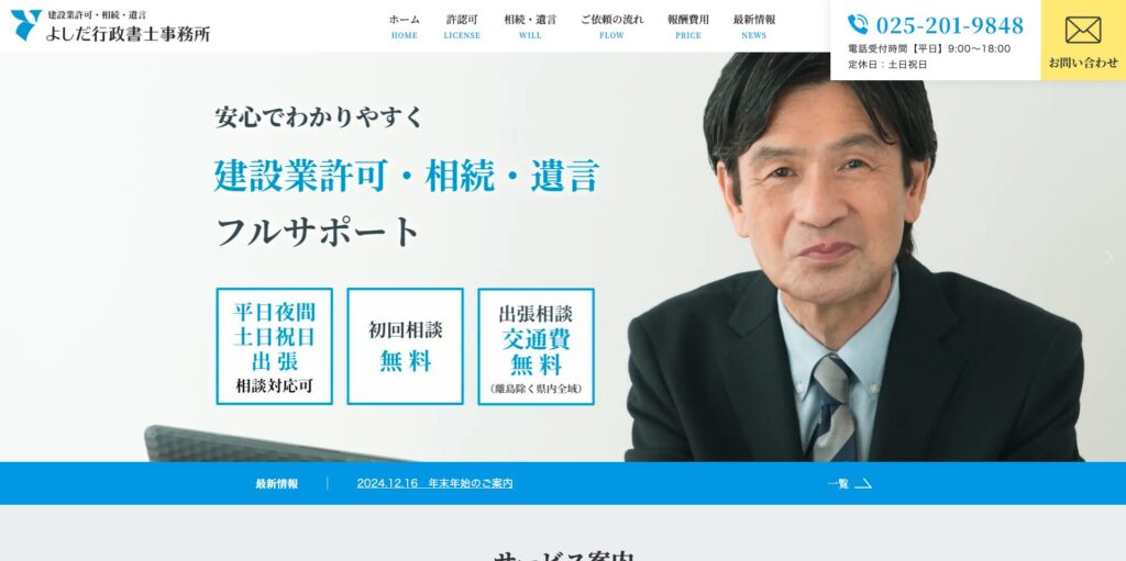 サービス案内では建設業許可や相続遺言など2大柱をアイコン付きリンクで案内し、事務所の特長(時間負担軽減・明朗会計・安心の説明)を画像付きで紹介。