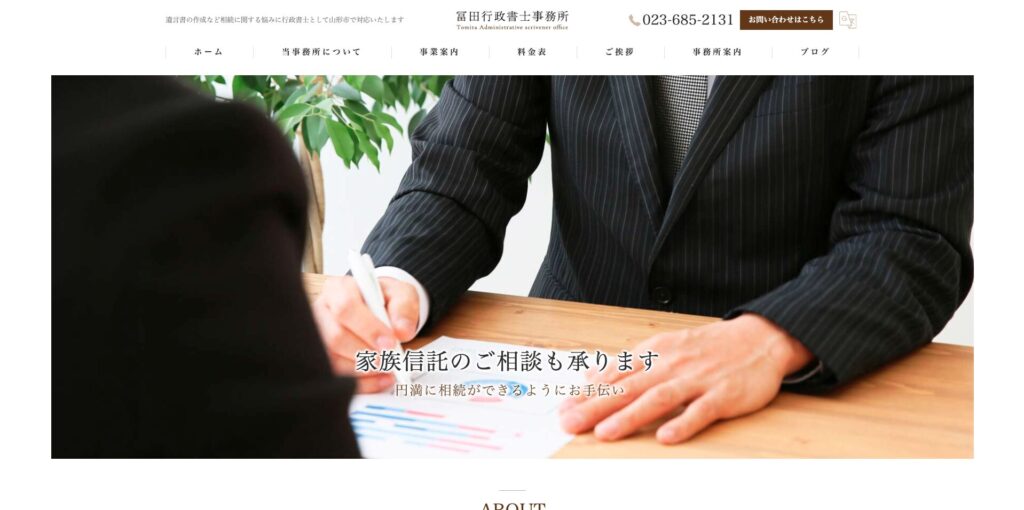 開業32年の経験を紹介する代表メッセージで顧客安心を強調し、遺言書や家族信託など相続関連業務を丁寧に説明する構成。