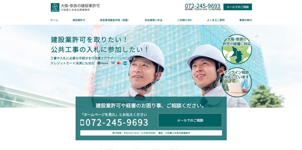 建設業許可申請や業種追加、経営審査など建設業者向け手続きをアイコン付きで列挙し、「初回相談無料」と明示して安心感を訴える。