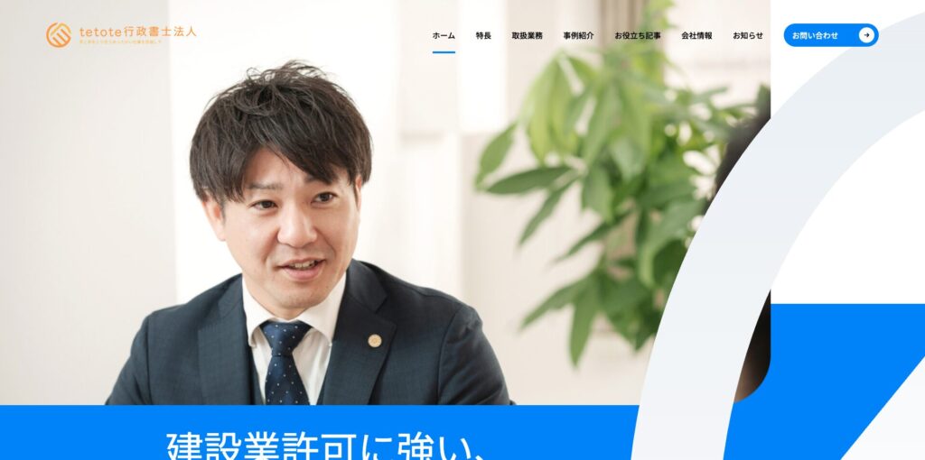 冒頭で「建設業許可に強い行政書士法人」と明示し、専任のプロが手続きをサポートする旨を打ち出している。