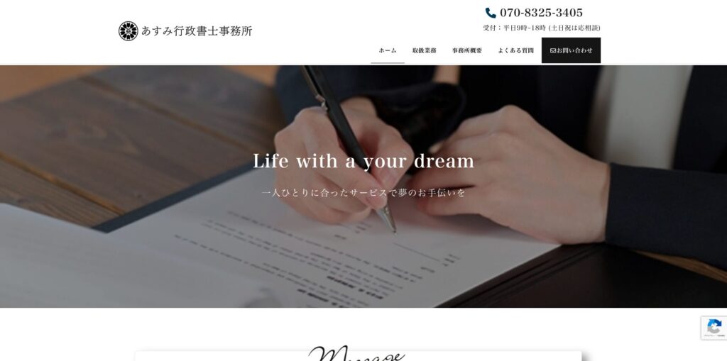 富山県高岡市の女性行政書士サイト。「Life with a your dream(一人ひとりに合ったサービスで夢のお手伝い)」というキャッチを目立たせ、スピード対応や丁寧フォローを「選ばれる3つの強み」として分かりやすく提示。