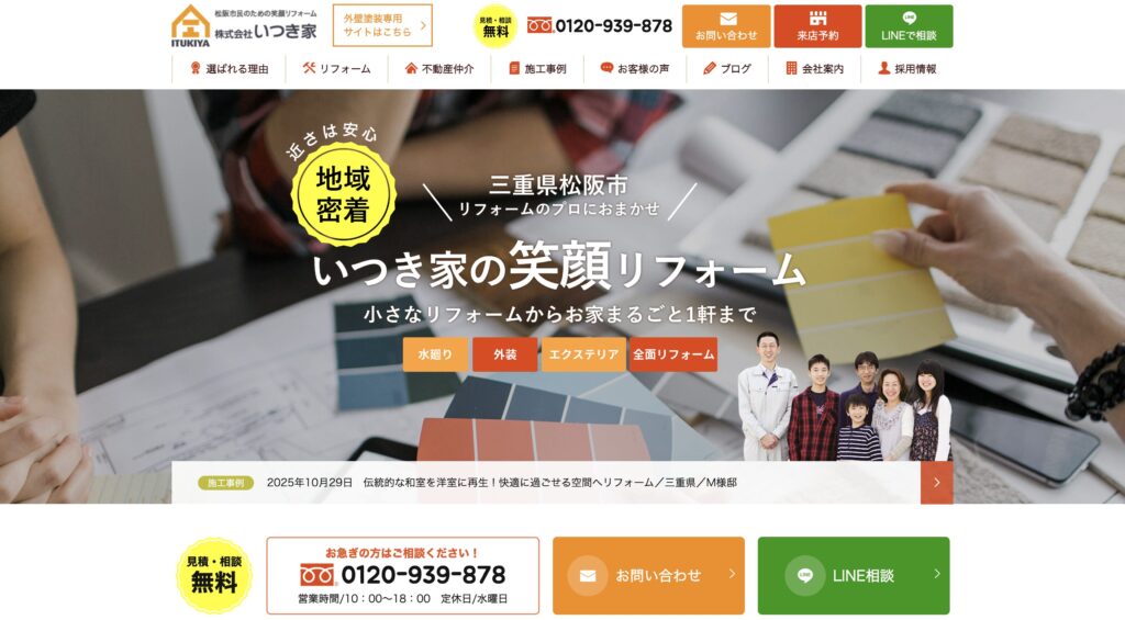 リフォームと不動産の両軸での事業展開を示すことで、総合的な住まいの相談先としての安心感と、生活全体を支える企業イメージを提示している。