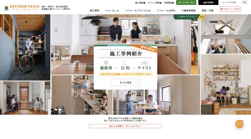 フルリノベーションから部分リフォームまでサービスを明瞭に分類し、経験豊富なプランナーのデザイン力と柔軟な提案力を訴求。