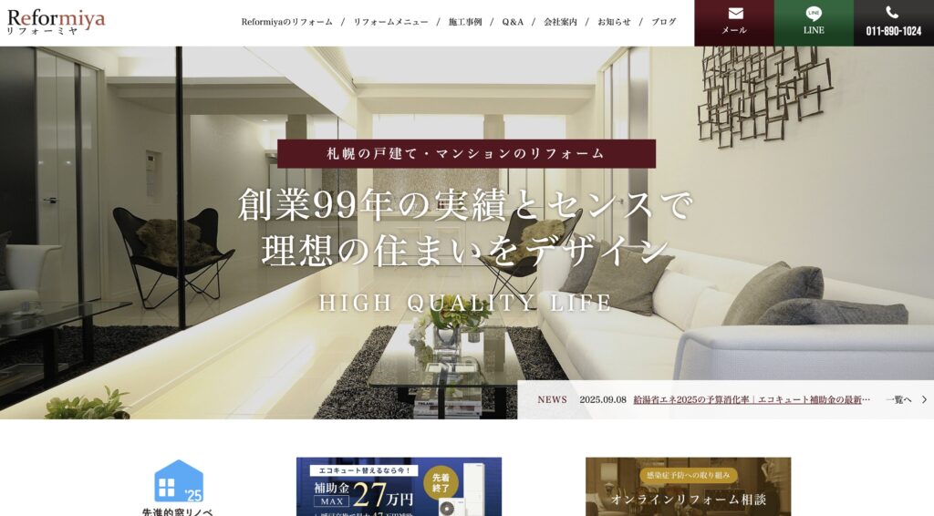 札幌市を中心に展開するリフォーム会社のサイトで、地域に根差した安心感と、豊富な実績数をストレートに訴求する機能的なデザインが特徴。