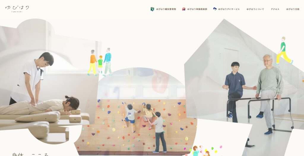 薄いイエローとネイビーをベースに、医療機関としての信頼性とジムとしての活発さを両立。「産後ケア」「交通事故」「トレーニング」といった目的別の入り口をトップページに明確に設けており、ユーザーが迷わず自分の求めている情報に辿り着ける設計になっている。