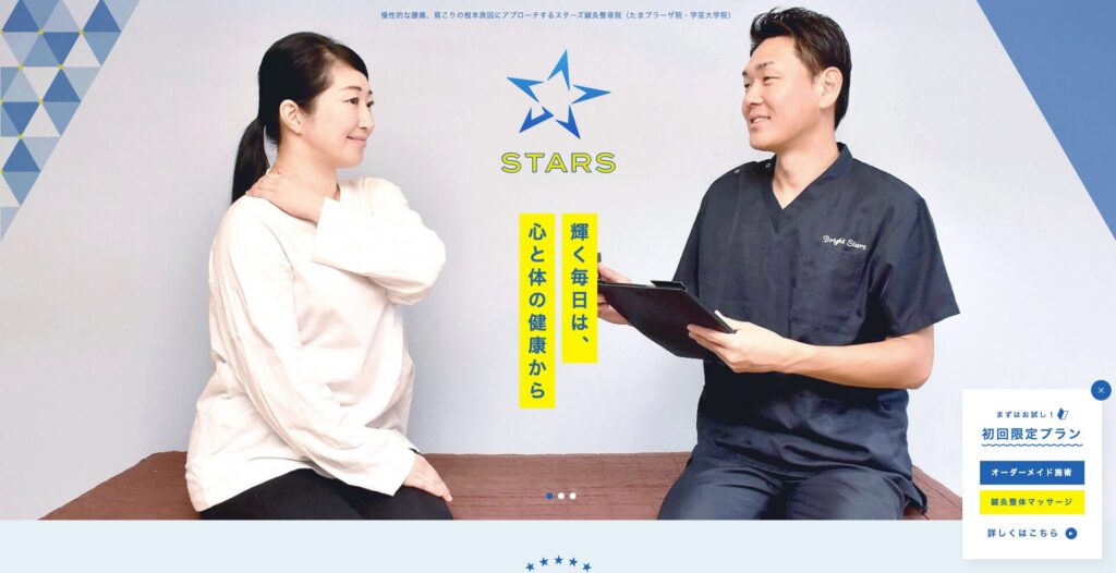 「5つ星のこだわり」というコンセプトがロゴやアイコン、全体の構成に反映されており、単なる治療院ではなく「身体のメンテナンスパートナー」としてのブランド価値を高めている。