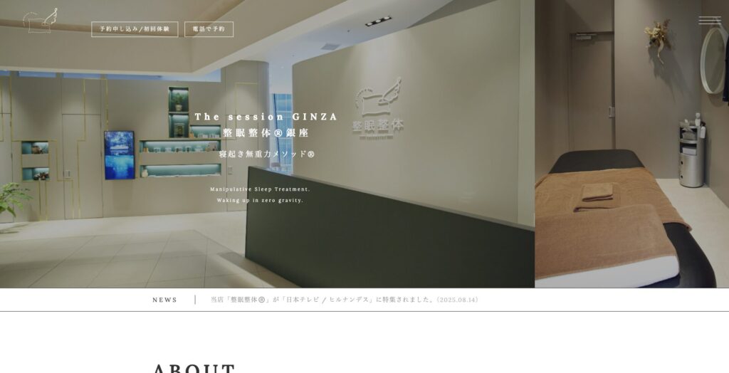銀座・東急プラザ内という立地に相応しい、ラグジュアリーで洗練された「サロン」としての整体院サイト。