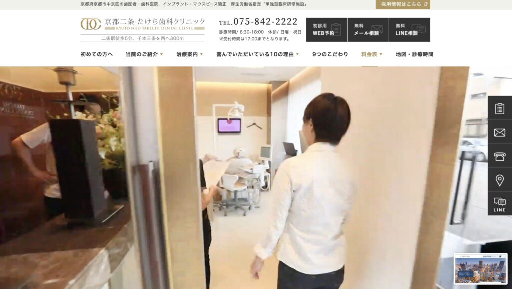 患者様が最も不安に感じる「いくらかかるのか」という疑問に対し、明確な料金表やすっきりとしたデザインで答えています。